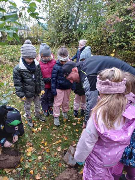 Die Kinder durften unter Anleitung ihrer Lehrer und Erzieher die Zwiebeln in die Erde setzen. Einige Vorschulkinder hatten das Glück, von ihren großen Geschwistern oder Freunden aus der 1. Klasse an die Hand genommen zu werden. Diese Unterstützung sorgte für ein Gefühl von Zusammengehörigkeit und machte das Pflanzen zu einem besonderen Erlebnis.